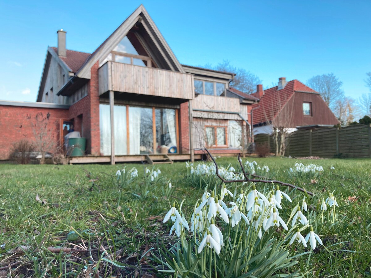Casa noastră este situată pe fiordul Schlei de la Marea Baltică și este ideală pentru familii, pasionați de sporturi nautice și pentru a lucra relaxat cu internet rapid! Casa se află la marginea unei case de vacanță, în mijlocul peisajului rural, cu vedere fantastică la Schlei. În câteva minute, vei fi pe apă. Casa, terasele mari și grădina oferă spațiu pentru joacă și relaxare pe orice vreme.