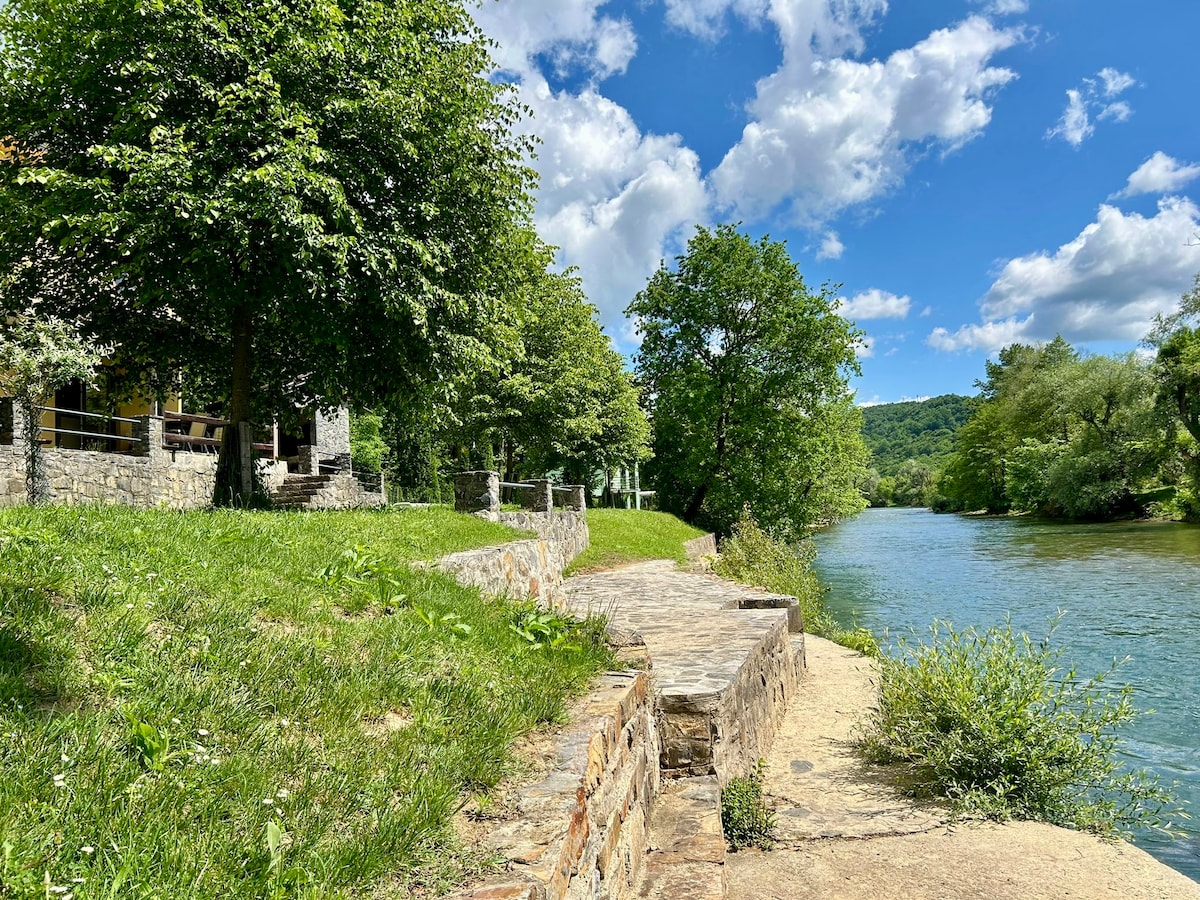 Cu terasă mare, situată în mijlocul frumosului râu Una. O casă are două etaje La etaj este un dormitor cu o mică galerie peste tot în jur! Bucătărie la parter, living, toaletă și duș! Potrivit pentru 3-4 persoane.