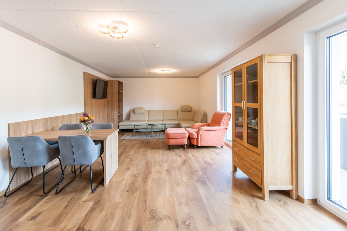 Bine ai venit la spațiosul apartament Panorama Suite by wellundfit. Te așteaptă un apartament mare, luminos și de lux. Apartamentul are trei dormitoare cu 6 locuri de dormit, un living mare, o bucătărie frumoasă cu zonă de luat masa, o baie și o toaletă pentru oaspeți, precum și o terasă pe acoperiș. Cu rezervarea ai, de asemenea, posibilitatea de a utiliza sala noastră de sport cu zonă spa (saună și cadă cu hidromasaj) în orice moment în timpul programului de funcționare.