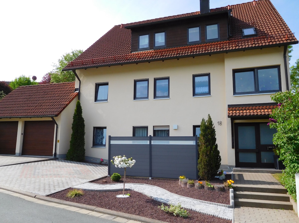 Bine ai venit la University & Festival City of Bayreuth, am dori să închiriem temporar apartamentul nostru mobilat cu dragoste de la parter într-o casă liniștită semi-detașată. Apartamentul mobilat se află în imediata apropiere a Hedwigskirche și poți ajunge în centrul orașului pe jos în 10 minute. De asemenea, noua noastră plajă urbană din Röhrensee poate fi accesată în câteva minute. Nu ezita să folosești bicicletele noastre, dar ar trebui să aduci propria încuietoare pentru bicicletă.