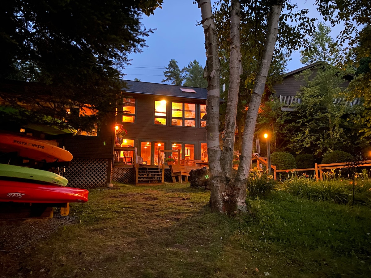 Casa noastră confortabilă în stil cabană, situată pe lacul Flower din Lacul Saranac, este o escapadă perfectă pentru o retragere relaxantă în Adirondack. Casa noastră stă pe vârful unui deal, izolată și liniștită - perfectă pentru a te bucura de priveliștea uimitoare a muntelui și a lacului pe tot parcursul anului. Proprietatea are propriul său doc privat accesibil pentru uzul personal al bărcilor cu motor și este dotată cu o canoe, 2 caiace și o barcă cu pedale pentru oaspeți! 5 minute până în centrul orașului Saranac Lake și 20 de minute până la Lake Placid. Caine prietenos, cu peste doi acri de teren!