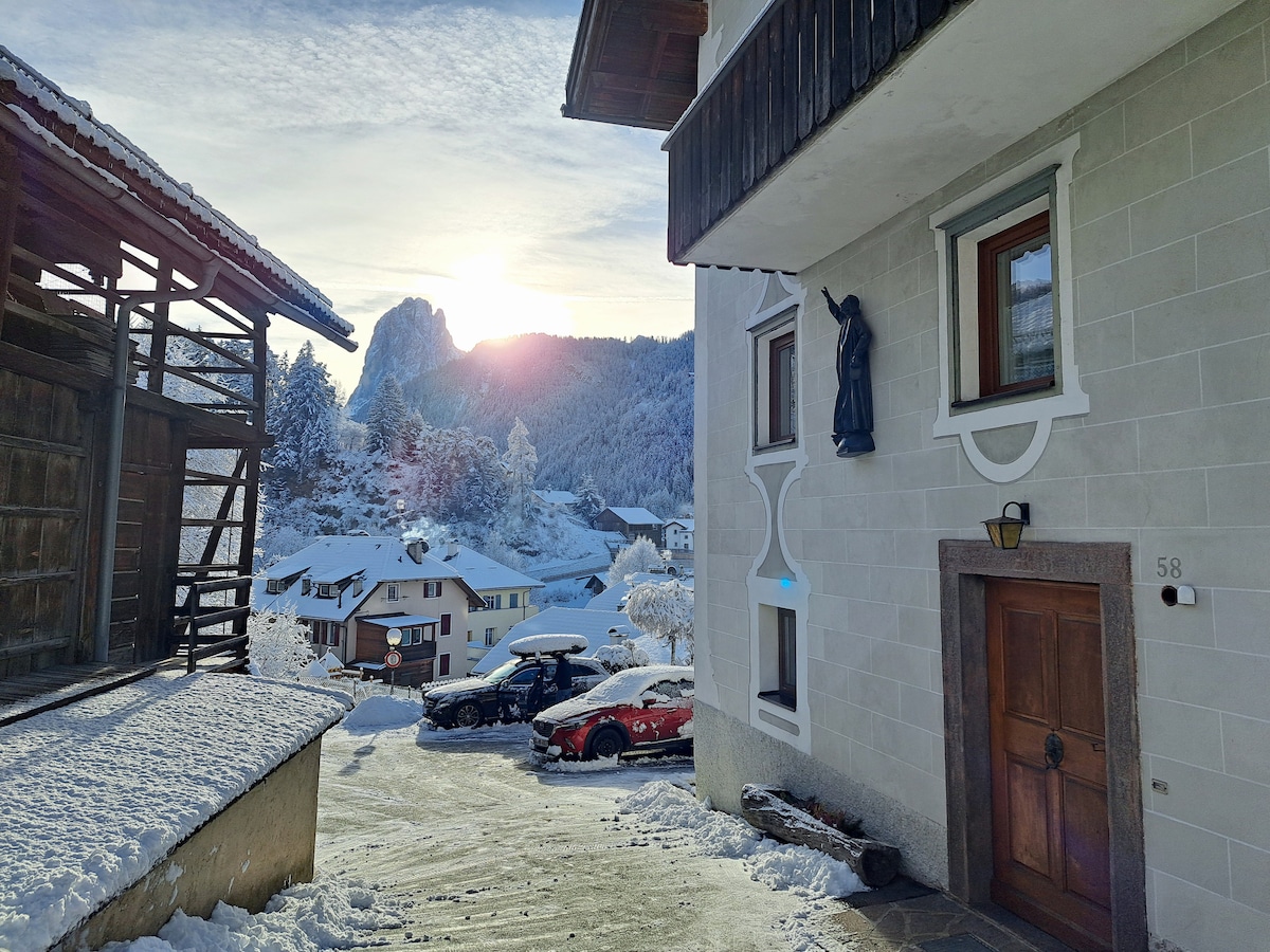 Apartament luminos cu două camere, cu vedere frumoasă la impunătorul Langkofel, Sellagruppe și Cirspitze, într-o locație însorită, izolat de toată agitația; totuși, la centrul satului se poate ajunge în doar câteva minute. Iarna, stația de autobuz de schi este la doar câțiva metri distanță și în cel mai scurt timp te afli în caruselul de schi. Copiii pot alerga liber, deoarece niciun drum nu trece pe lângă casă, dimpotrivă, un traseu de drumeții, așa-numita „Via Crucis”, începe chiar în fața ușii din față.