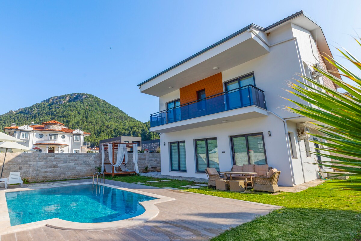 Relax within the beautiful forests of Yeşilüzümlü of Fethiye, where you will be far away from the scolding hot weather of the city center and still make the best of your holiday enjoying a cold breeze, a spacious private pool alongside outdoor dining facilities and luxurious rooms each equipped with private bathrooms. You can still enjoy the city center and the beaches as it is only 10 km to most attractions and wake up to these unique mountains and greenery.