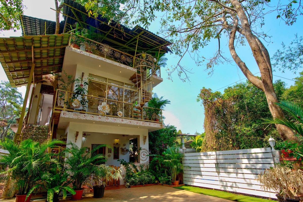 Trăiește într-o grădină liniștită și magică într-o casă cu etaj. Situat într-un cartier liniștit, aproape de toată acțiunea pe care Goa o oferă. Locuința noastră se află la mai puțin de 2 km de mai multe restaurante pentru toate bugetele, cluburile de noapte și centrele de tratament spa/masaj. Plajele Vagator și Anjuna se află la 2-3 km, unde poți găsi sporturi nautice și magazine. O să-ți placă locuința noastră pentru spațiul în aer liber, un pat confortabil și un aspect unic. Locuința noastră este potrivită pentru cupluri și familii (cu copii)