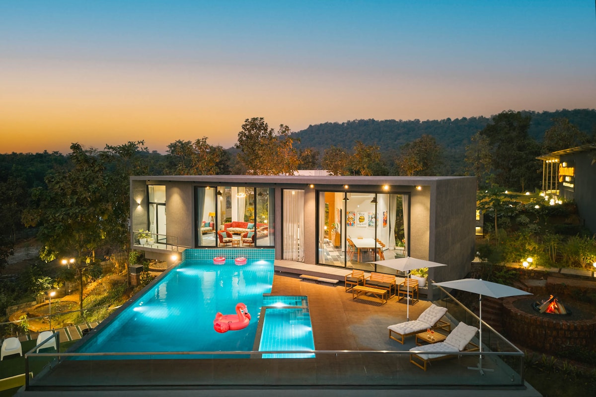 This is a luxurious 5 BHK villa situated amidst the stunning mountains of Sahyadri. The name "Panache" refers to flamboyant style or flair, and this villa certainly embodies that essence. The home boasts of a unique A-shaped design, private infinity pool, Veranda with a cosy lawn, modern interiors & comfortable bedrooms. Whether you're in search of private villas in Igatpuri, family villa in Igatpuri with private pool or the best luxury villas in Igatpuri, this place has it all!
