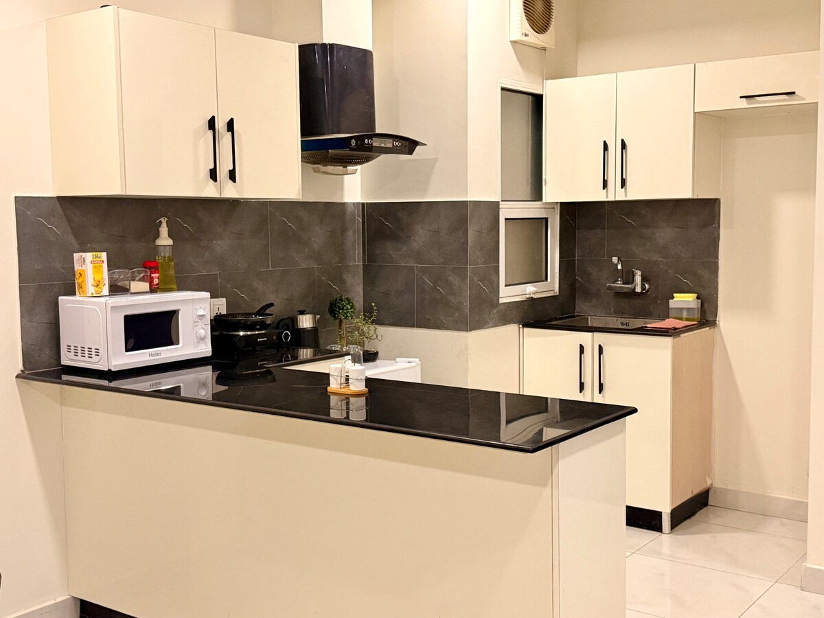 Step into a modern retreat designed for comfort and mood. The apartment features a stunning starlight ceiling that creates a calm, romantic atmosphere. Enjoy cinematic nights on a 65-inch Haier Android TV with high-speed Wi-Fi for seamless streaming. The equipped kitchen offers everyday convenience, while the soft mattress and spacious sofa ensure complete relaxation. Finished with modern interiors and artistic aesthetics, this space is perfect for cozy nights and stylish living.