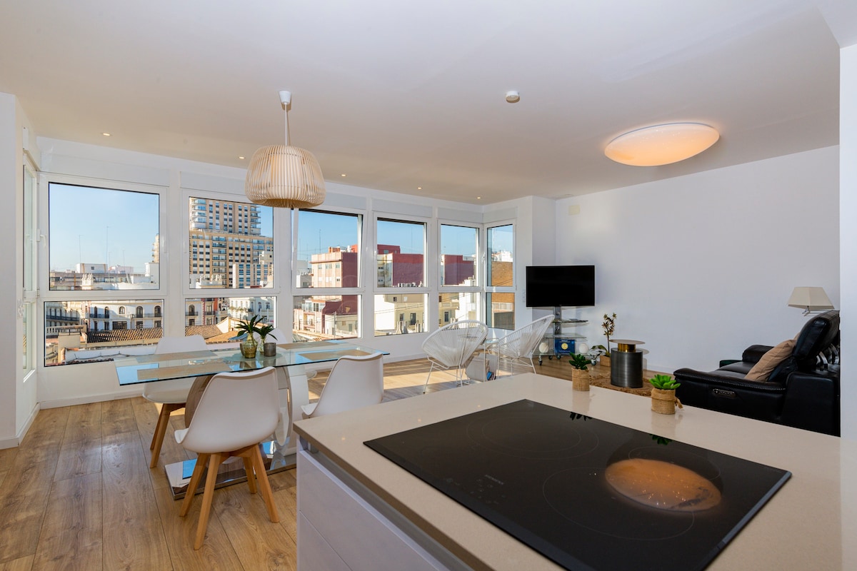 Ático de lujo junto al Mercado Central, en el centro histórico de la ciudad, se accede andando a la mayoría de sitios. Edificio rehabilitado, tiene 3 dormitorios con camas de 150x200cm, 2 baños completos, 1 aseo y salita con sofá-cama (capacidad máxima 8 huéspedes) Amplio salón-comedor-cocina con gran ventanal de madera Tiene calefacción y aire acondicionado en todas las estancias, ventiladores de techo y cocina totalmente equipada Terraza privada para disfrutar al aire libre Tiene ascensor