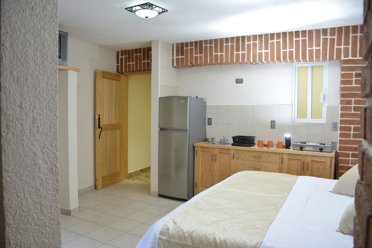 Apartament frumos și confortabil pentru un până la patru persoane, cu acces independent și parcare în interiorul proprietății pentru o mașină, cu opțiunea de a parca o altă mașină în afara proprietății. La doar trei minute de centrul orașului Avandaro, pe o stradă liniștită cu vedere spre pădure. Există un pat dublu, o canapea extensibilă dublă, o baie completă, TV cu Netflix, WiFi, un birou cu un scaun foarte confortabil, minibar și cafetieră.