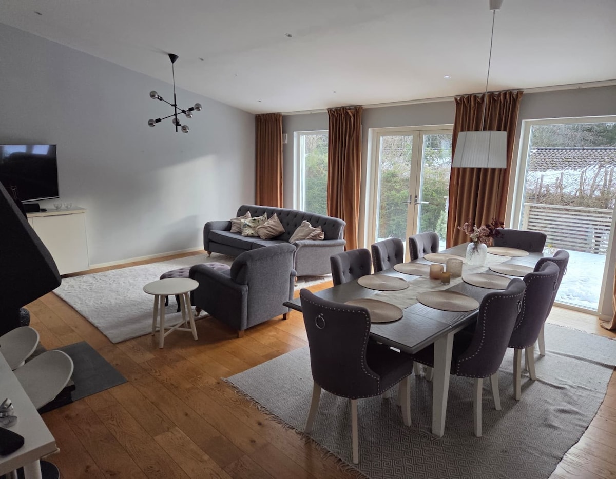 Curățenia, lenjeria de pat și prosoapele sunt incluse. Zonă naturală liniștită, cu bucătărie completă și bucătărie în aer liber, trambulină, leagăn, mașină de spălat vase, mașină de spălat vase, mașină de spălat rufe, uscător automat de rufe, AC, terasă, grătar, proiector TV, încărcător EV, parcare gratuită. Jacuzzi (verifică disponibilitatea) sau saună privată (întotdeauna disponibilă): 600 SEK/zi, reducere pentru 1+ utilizări. 30 m² + 15 m² mansardă de dormit sigură pentru copii: pat supraetajat (140+90), canapea extensibilă de 120 cm, saltea de 140 cm, 2×90 cm. Boattrip: https://air.tl/IyysCYpY Mare: 5 km, Magazin: 1,5 km, Autobuz: 400 m, Golf: 2 km
