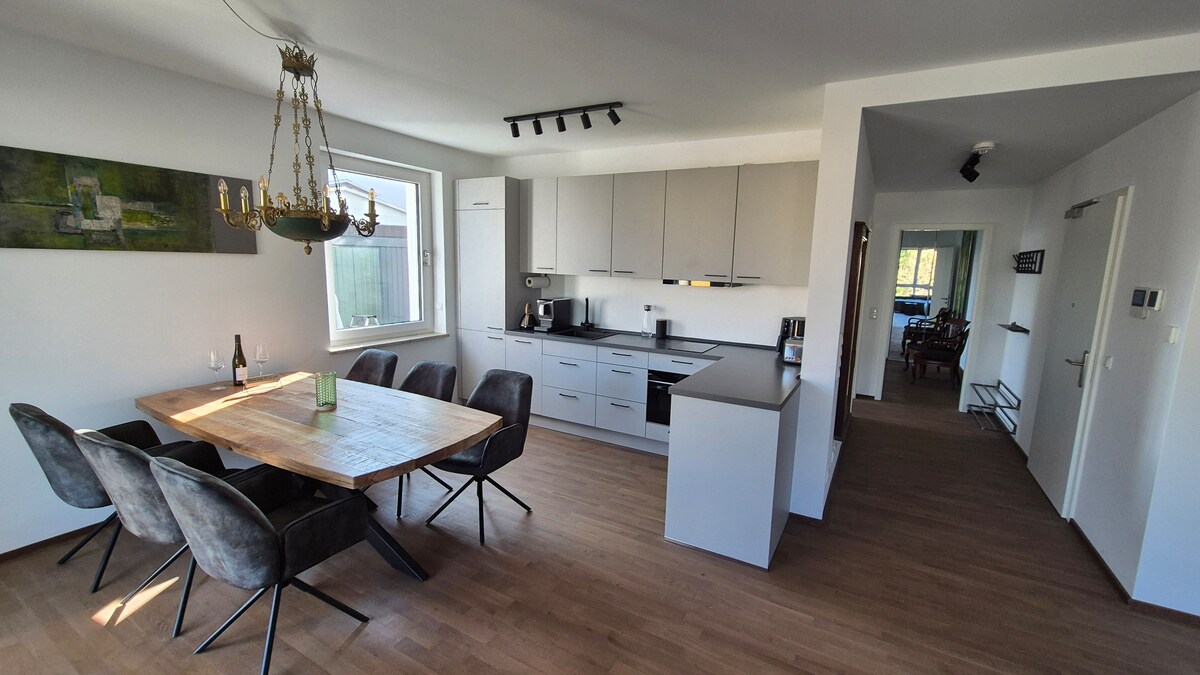 Relaxează-te în pace pe canapea, cadă de baie sau cu un pahar de vin franconian pe balcon după o zi lungă de vizitare a obiectivelor turistice din orașul Würzburg din apropiere, de la o drumeție pe ILE Panoramawanderweg sau o plimbare cu bicicleta pe pista principală de biciclete. Poți obține o stropire de la televizor în camera de dormit cu un ceai sau o cafea proaspăt gătită de la aparat. Gătește pentru tine sau lasă-te răsfățat de italieni, indieni sau turci de la fața locului.