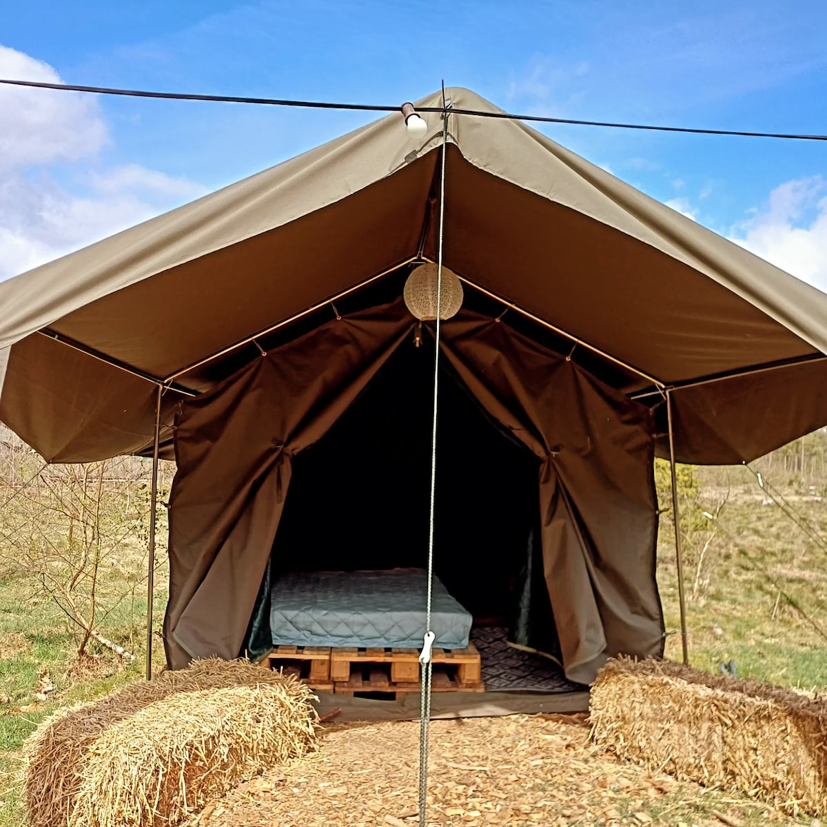 Een prachtige tweepersoonstent gelegen op 'Boerderij Buitengewoon' op landgoed Tongeren. De tent staat op een klein en rustig veldje aan de rand van het bos. Het veldje is onderdeel van 'Boerderij Buitegewoon'; een zorgboerderij met verschillende dieren. We vertellen er graag meer over! Het is een fijne plek om heerlijk te ontspannen en te ontsnappen aan de drukte van alledag. Bij de tent bevindt zich een heerlijke houtgestookte hottub!