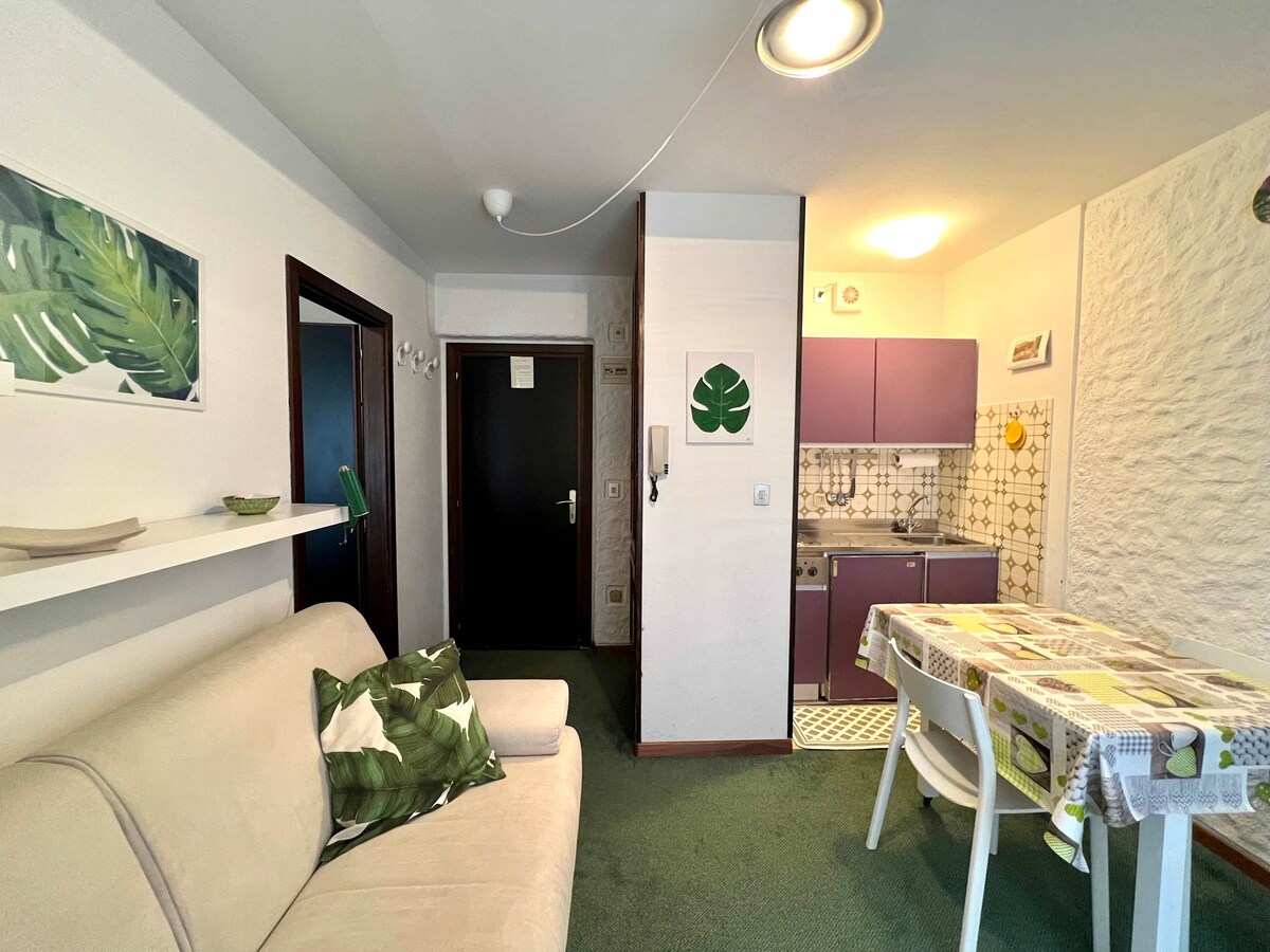 Un MINI APARTAMENT FRUMOS CU VEDERE LA MARE, cu UN BALCON MARE CU VEDERE LA MARE, bucatarie mare, dormitor mare dublu cu baie, cu un pat dublu şi o canapea care, la cerere, se transformă într-un pat confortabil single, dotat cu TV, Wi-Fi şi o vedere panoramică splendidă la laguna Veneţia.