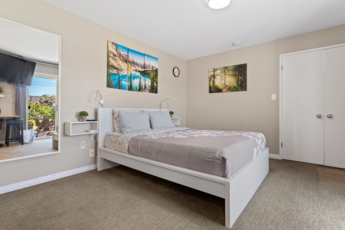 A separate entrance is a portal to a luxurious self-contained modern cottage in a secluded walled shared garden. Sliding glass pocket doors look over the lily pond and hummingbirds. The tree-shaded bedroom has cork floors for quiet comfort and a sliding wood panel door. The bathroom has a shower with floor to ceiling frosted windows, and there is a private rear deck. This contemporary modern suite features vibrant colors and artwork throughout. HEPA AIR FILTRATION 24HRS.