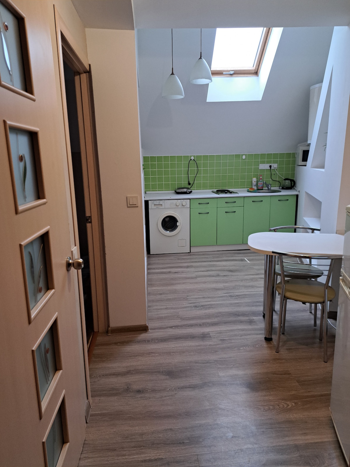 Relaxați-vă și destindeți-vă într-o casă confortabilă și elegantă, cu vedere pitorească la munți. Situat în satul Lavochne (pe drum de pământ 10 km până la Slavsk, 20 km până la Plai). Ideal pentru 1-4 persoane. Suprafața casei este de 35m2, suprafața terasei este de 20m2. În apropiere se află un magazin cu tot ce aveți nevoie, nu departe de pârâu și pădure. Există o gară unde opresc trenurile pe distanțe lungi, astfel încât să puteți ajunge cu ușurință de la Kiev, Harkov, Lviv etc.