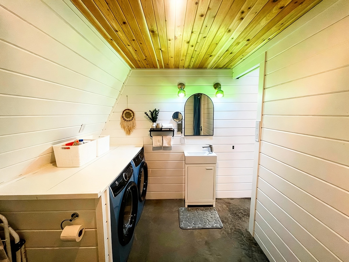 Zonă deschisă de living și bucătărie. Două dormitoare cu paturi matrimoniale. Prețul este pentru patru persoane dacă folosești doar cele două paturi. Există o saltea pneumatică înălțată de dimensiuni queen (24 de inchi înălțime) disponibilă, dacă este disponibilă o saltea pneumatică înălțată de dimensiuni queen (24 de inchi înălțime) pentru o taxă suplimentară per pat (10 dolari pe noapte per pat suplimentar). Două băi, una cu cadă completă/duș și una cu duș. Terasă acoperită cu canapea și masă de terasă din patru piese, așezată în mijlocul pădurii mele culinare. Câinii dresați pentru folosirea literei sunt bineveniți contra unei taxe suplimentare pentru animale de companie (maximum 2).
