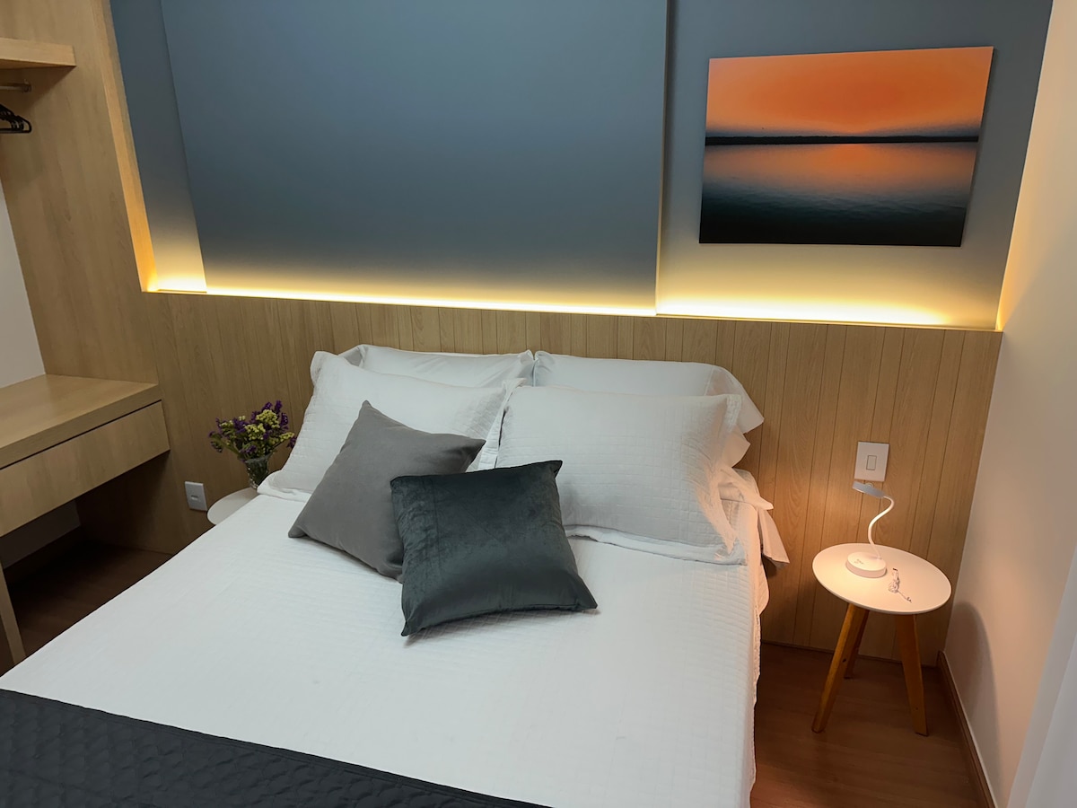 Apartament nou și confortabil la câțiva metri de plaja Beverly Hills, Itapuã, Vila Velha/ES. Apartament întreg, complet, zonă de agrement pe acoperiș cu piscină și saună eliberate pentru oaspeți. Apartamentul are o bucătărie completă, un living cu TV inteligent și un ventilator de tavan, baie cu duș electric, spălătorie, cameră cu aer condiționat (split) și cu Smart TV, un cartier liniștit, cartier excelent.
