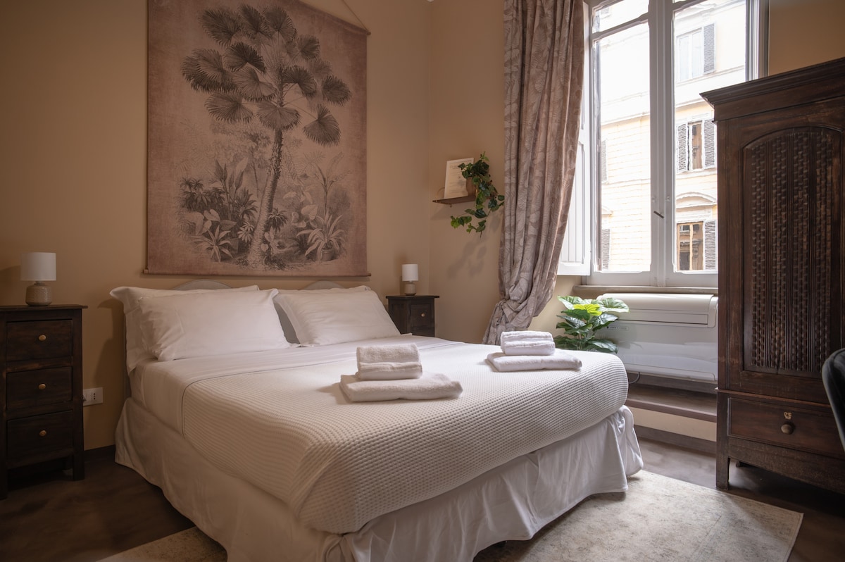 1 minut de Piazza Navona la etajul 3 al unui Palazzo istoric (secolul al XVI-lea) te așteaptă o cameră luminoasă și liniștită, cu pat dublu matrimonial și baie privată. Oaspeții au intimitate totală. Fără lift, fără televizor, fără bucătărie. Notă privind motivul Corona /Covid-19: pensiunea noastră cu mic dejun are aceleași caracteristici ale unei cazări la hotel. Împarți doar camera mică de intrare cu proprietarii de apartamente și, prin urmare, ești complet independent de restul apartamentului!