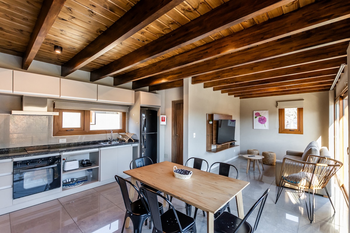 Cabană în stil rustic pe malul lacului Nahuel Huapi cu jacuzzi, casă cu lemne și punte. Studio creat pentru relaxare și romantism cu vedere la răsăritul soarelui și la răsăritul lunii deasupra lacului. Smart TV și internet PRIN FIBRĂ OPTICĂ cu wifi pentru muncă. O kitchinette cu tot ce este necesar, inclusiv un filtru de cafea cu gust dulce. Cutie de siguranță pentru a-ți proteja notebook-urile atunci când mergi pe jos. Baie completă. Piscină, ping-pong. Plajă: caiac și vâsle în picioare. Mic dejun continental.