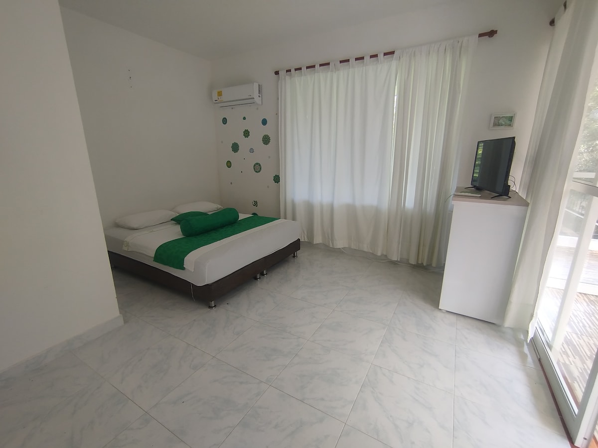 Cómoda habitación con cama doble, sofá cama, baño privado y balcón. Ideal para parejas, acompañantes médicos o viajeros que buscan un espacio tranquilo y funcional. Disfruta de WiFi, acceso a cocina compartida, comedor y sala de TV en un ambiente natural con estilo boho, muy cerca del Hospital Departamental y centros médicos en Villavicencio.