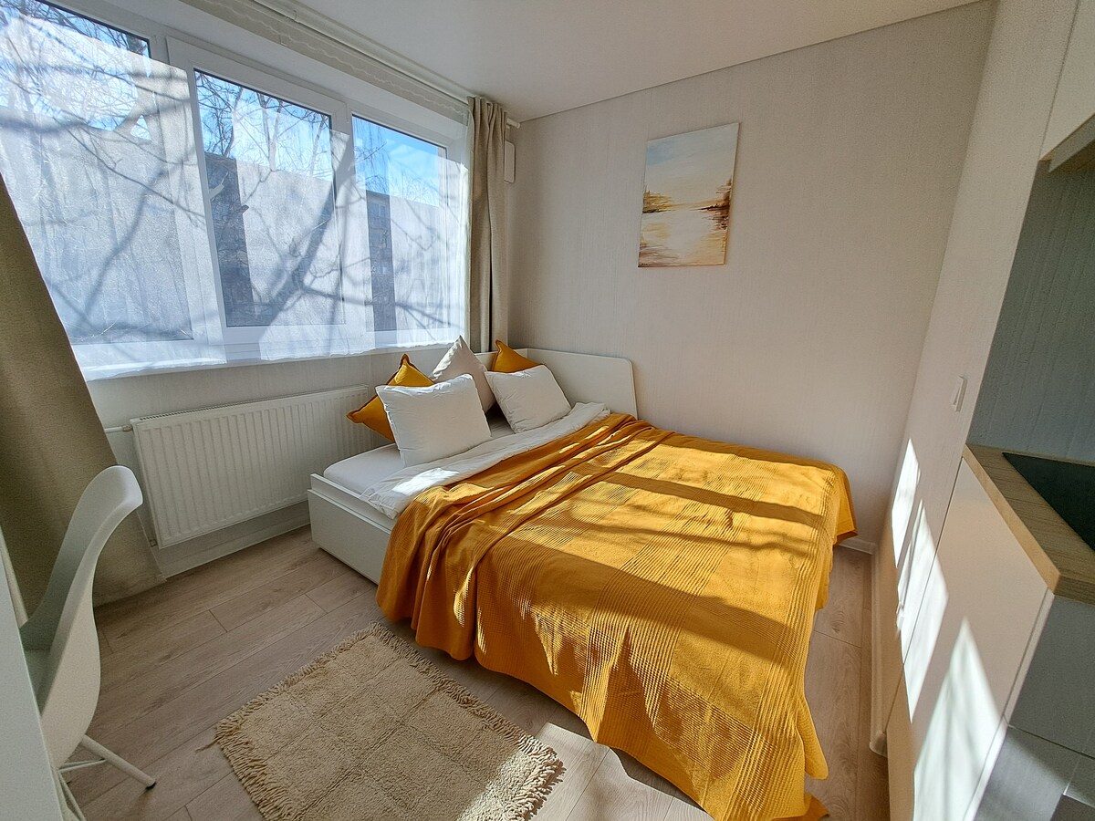 Cuibușorul meu, complet renovat, este perfect pentru două persoane cărora le place confortul, funcționalitatea și confortul, într-un loc atât de mic încât este tot ce aveți nevoie, veți putea să vă spălați și să vă uscați hainele, să gătiți, să vă bucurați de mâncare și să vă odihniți într-un loc liniștit și vesel. Locația este foarte convenabilă pentru călătorii care vin cu trenul (400 de metri), autobuzul (550 de metri) sau avionul (4 stații de autobuz), se află în cel mai modern cartier din Vilnius și la doar câteva minute de mers pe jos de orașul vechi.