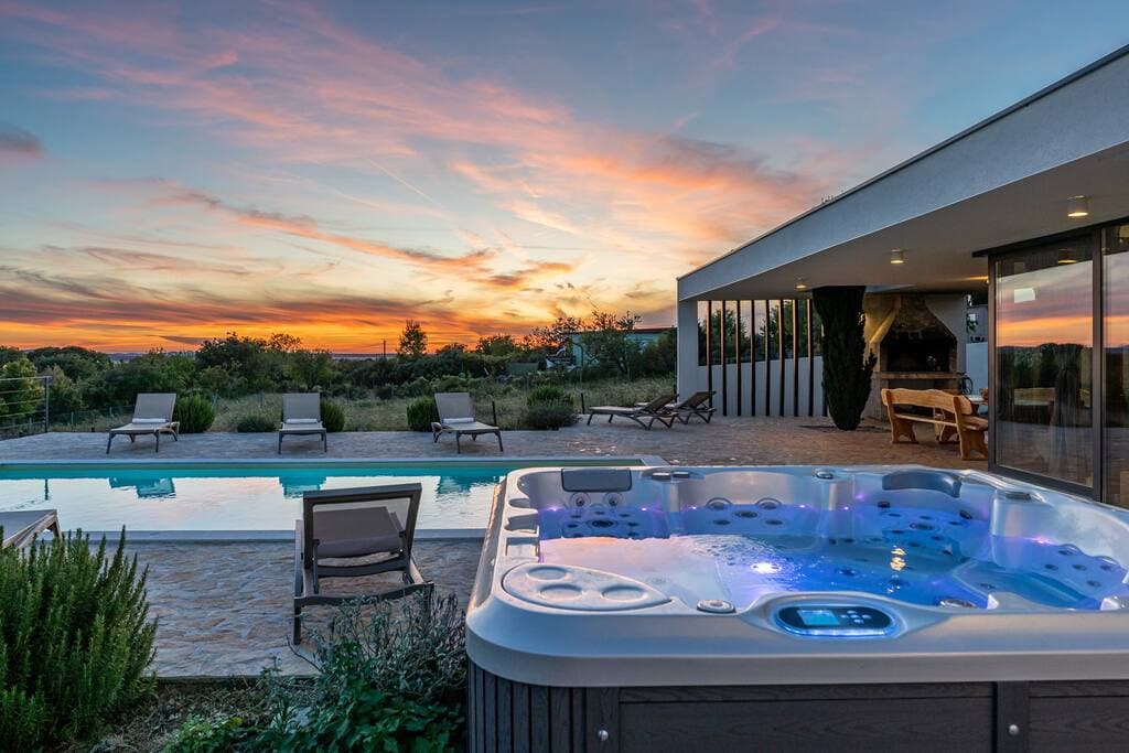 Această vilă nou-nouță se află într-o locație liniștită și este înconjurată de natură frumoasă. Vila este formată din 4 dormitoare, un living cu o sală de mese, o bucătărie complet utilată, trei băi, o terasă , un loc de parcare și o piscină încălzită. Toate camerele sunt dotate cu aer condiționat, iar o cameră are o baie privată. Casa este situată la 10 minute de mers cu mașina de cea mai populară plajă cu nisip și la 10 minute de orașele Zadar și Nin. Restaurantele și magazinele sunt, de asemenea, situate în apropierea cazării.