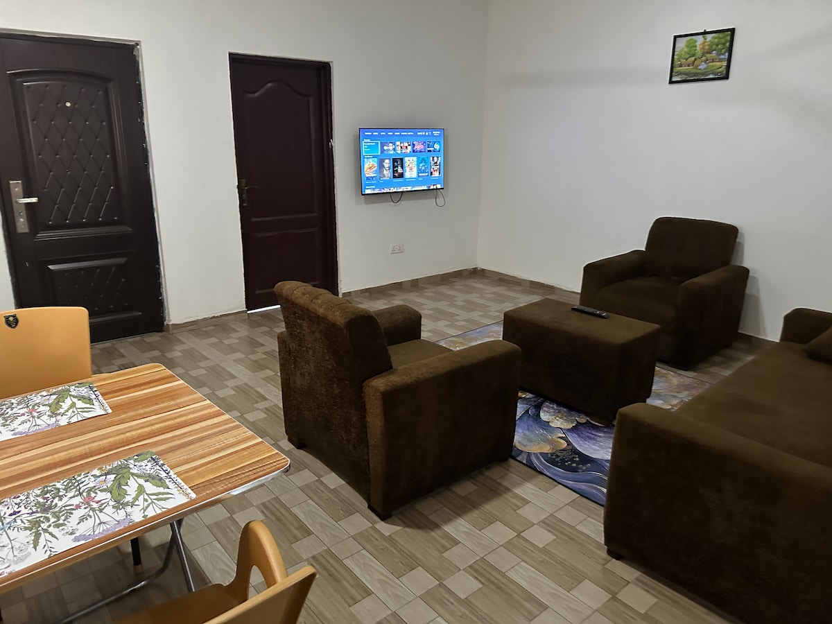 Apartament I BR situat la St. James Atimpoku, la 3 minute de mers cu mașina de Royal Senchi Hotel and Resort. Spațios și are un dormitor cu pat matrimonial, baie, living cu canapele, WiFi, Smart TV atât canale locale, cât și internaționale, bucătărie cu aragaz(nu cuptor), frigider, ustensile de gătit, set de tacâmuri. Generator de așteptare disponibil în perioadele de întrerupere a alimentării cu energie electrică