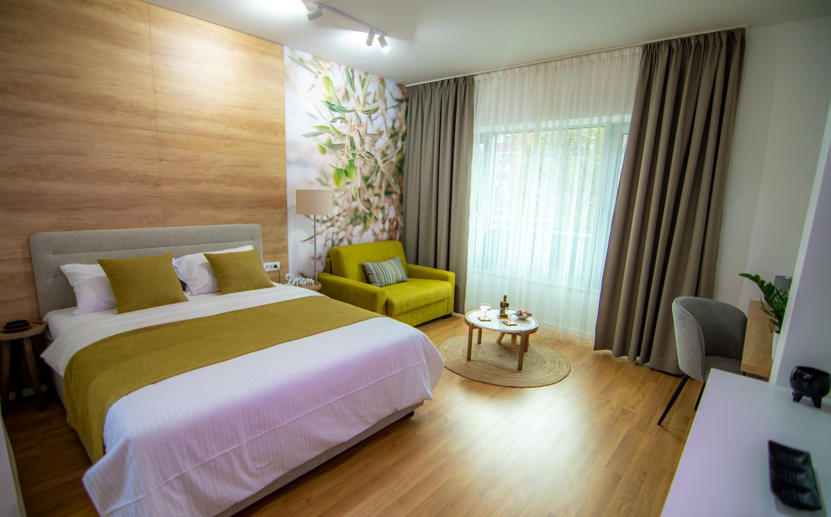 Bucură-te de o experiență elegantă în acest loc situat central într-o clădire nouă. Apartamentul este format dintr-un dormitor luminos cu un pat matrimonial confortabil, o masă pentru 4 persoane și o bucătărie modernă complet utilată. Un living însorit cu Smart TV. Colțul extensibil din living poate servi, de asemenea, ca un pat suplimentar pentru încă 2 oaspeți. Întregul apartament a fost proiectat de arhitect (Adil Glavovic - axarchiteture)