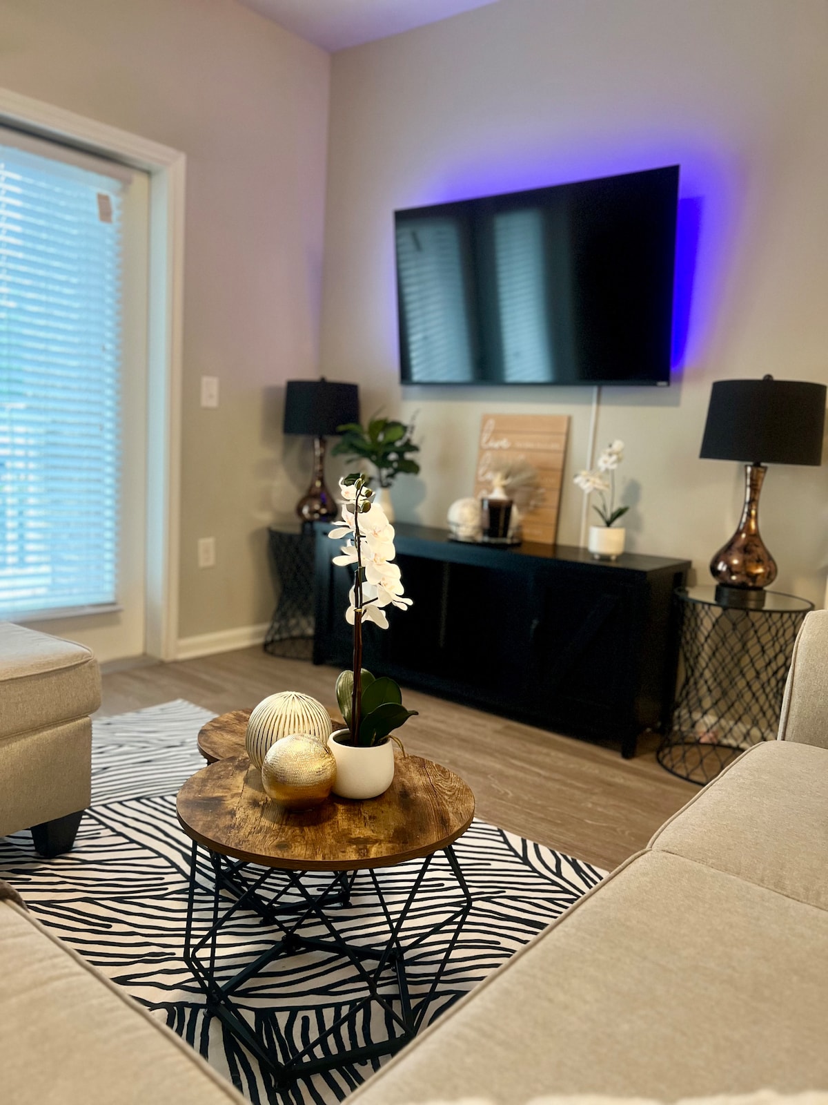 You’ll love this stylish condo. We take great pride and put great care into our property. It has been updated with new flooring and appliances and is clean, cozy, and charming. Enjoy nearby fine, casual, or quick dining and all types of shopping. You will want to stock up and stay home to relax, cook, and enjoy the large screen TVs and high speed Internet service (just like home). Stay a night, weekend or a few months. The fenced in yard is perfect for your furry four-legged family members.