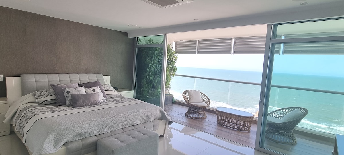 Penthouse - Duplex 260 metros cuadrados, amplias terrazas en sus dos pisos, Jacuzzi privado en balcón del piso superior, tina cubierta privada en el baño principal, sonido ambiental wifi en 3 espacios diferentes, aires integrales en techos, TV gigantes, y las mejores vistas directas al mar de todo Cartagena, te harán sentir una verdadera sensación de confort en este espectacular apartamento, con hermosos acabados y accesorios . Además, tiene una ubicación estratégica: ¡Queda cerca de TODO!