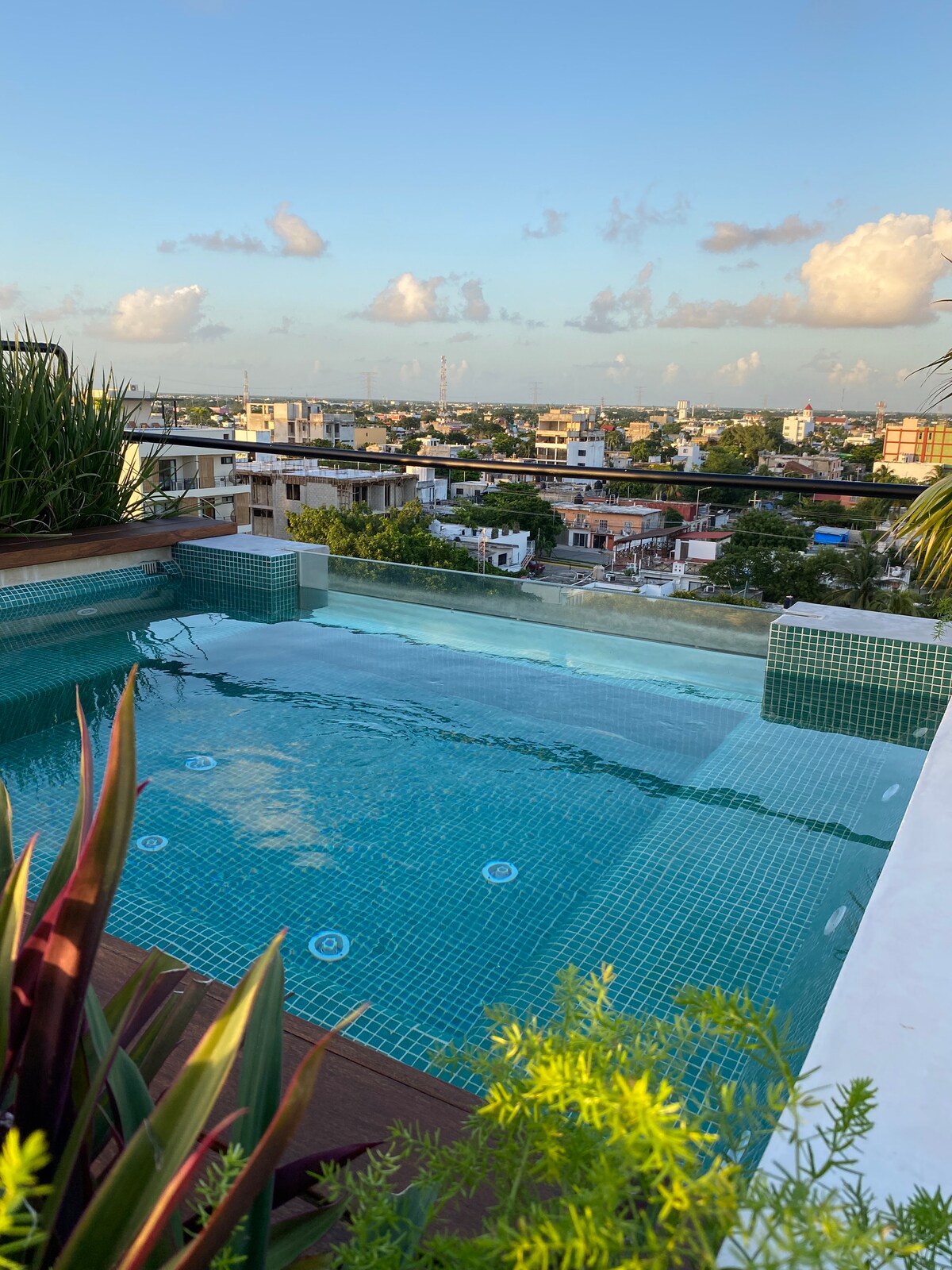 Seaside Escape: Rooftop Studio with Stunning Views 🌊 Experience the best of Playa! This modern rooftop studio offers breathtaking ocean views and a fresh Caribbean breeze. Located in the exclusive hotel zone (next to Hyatt Vivid), you’re steps from 5th Ave. Relax on your spectacular private terrace, featuring a secluded outdoor tub (ambient temp) overlooking the sea—perfect for couples! ⚠️ Note: Access involves 16 stairs; not suitable for guests with mobility impairments.