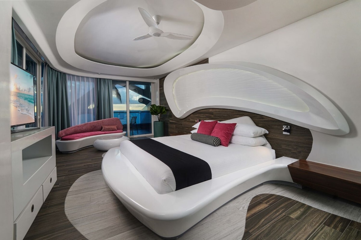 Suită principală cu vedere panoramică la Marea Caraibelor și acoperiș privat cu piscină mică, două lounge-uri, lounge și duș. Are un pat matrimonial, o canapea extensibilă și un balcon cu vedere la plajă, videoproiector cu aplicații de streaming și un sistem de sunet. Are o bucătărie modernă cu aragaz electric, frigider, prăjitor de pâine, cafetieră și ceainic, cu oferta de ceaiuri și cafele. Dotări incluse, cum ar fi Wi-Fi gratuit, prosoape de plajă, uscător de păr, uscător de păr, seif.