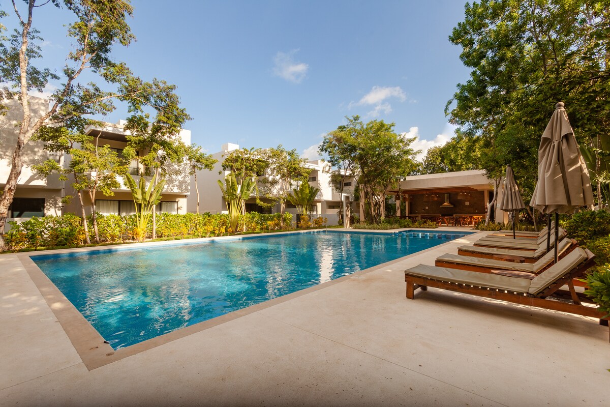 Amazing DEPARTAMENTO ZAMMA , con una vista soñada a su ALBERCA PRIVADA. Disfrutá de una cocina equipada, cama King Size, Smart TV, WiFi de 500 Mbps y una terraza con alberca privada con vista a la naturaleza. Descansá en este entorno sereno, dentro del complejo CASA JUNGLA, ubicado en un fraccionamiento privado sobre la calle 38, a solo 2 cuadras de la 5ta Avenida, la playa, restaurantes y supermercados.