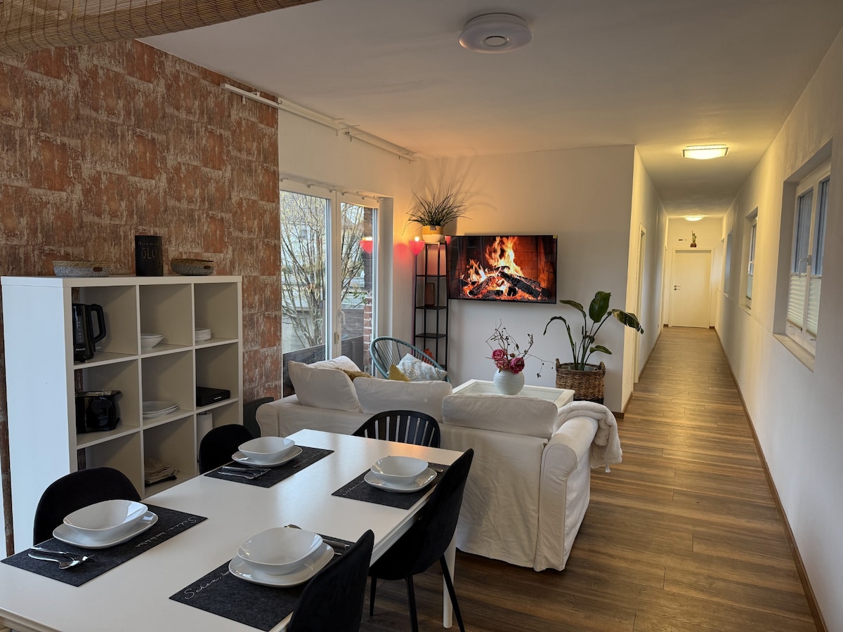 Apartament frumos de 65 m² în inima orașului Duisburg, cu un balcon mare 🏖️ (inclusiv zonă de relaxare și Strandkorb) și legături perfecte cu Duisburg Central, Düsseldorf și Messe Düsseldorf 🚆 Punctele principale: U-/stație de tramvai (Platanenhof) 200 m (U79/903) 🚋 Central, dar liniștit 🌳 Încălzire prin pardoseală 🔥 Bucătărie complet utilată. 🍽️ Spațiu pentru biroul de acasă 💻 Duș cu efect de ploaie 🚿 Bar în cameră 🍷 Televizor inteligent cu Netflix 📺 Ideal pentru călătorii în oraș sau șederi de afaceri ✨ Stație de încărcare rapidă pentru mașini electrice chiar pe stradă ⚡🚗