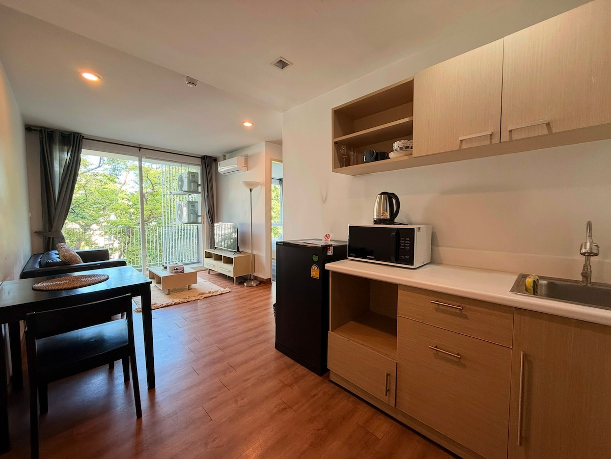 Apartament modern de lux în zona bine cunoscută Rama IX. Bucură-te de un spațiu de locuit luminos, cu un pat confortabil, chicinetă complet utilată, Smart TV și baie curată. Clădirea oferă o piscină, sală de gimnastică, securitate non-stop și acces ușor la cafenele, magazine și mijloace de transport. Perfect pentru cupluri, persoane care călătoresc singure sau persoane care călătoresc în interes de afaceri și care caută confort și comoditate :)