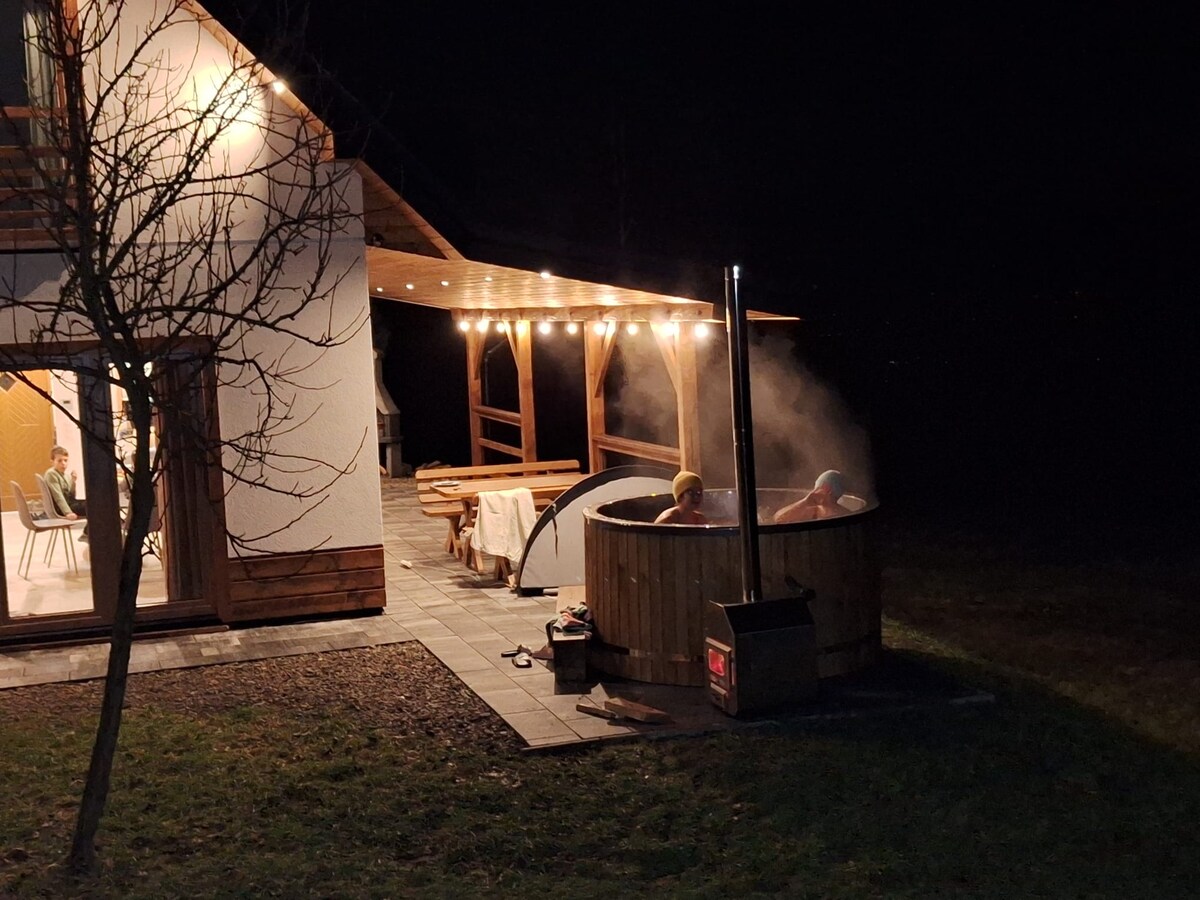 Situat pe versantul sudic, în mijlocul unei păduri private cu o priveliște uimitoare și departe de alte clădiri, îți oferă posibilitatea de a te relaxa și de a scăpa de tot. O terasă duplex cu vatră și cadă cu hidromasaj, un living spațios, o sufragerie și o grădină mare și o pădure în spatele casei îți permit să te relaxezi pe deplin chiar și cu un grup mai mare de oameni. Parcarea spațioasă pentru 8 mașini îți oferă libertatea de acces individual pentru fiecare participant. Restaurantele locale au o gamă largă de feluri de mâncare livrate în casă.