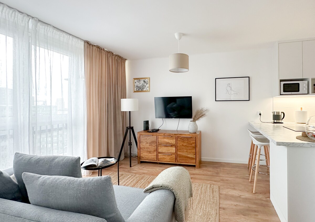 Apartament confortabil, complet echipat, într-o clădire nouă. Un living cu o bucătărie deschisă împărțită într-o zonă de luat masa și de relaxare. Dormitorul are un pat mare și un dulap spațios. Există, de asemenea, un dulap de intrare ca spațiu suplimentar de depozitare. Există magazine, restaurante și cafenele în apropiere Echipament: aer condiționat, espressor, fier de călcat, mașină de spălat rufe Cum să ajungi de la Aeroportul Chopin 20 de minute de taxi 50 de minute de comunicare de la Aeroportul Modlin 50 min taxi 120 min comunicare