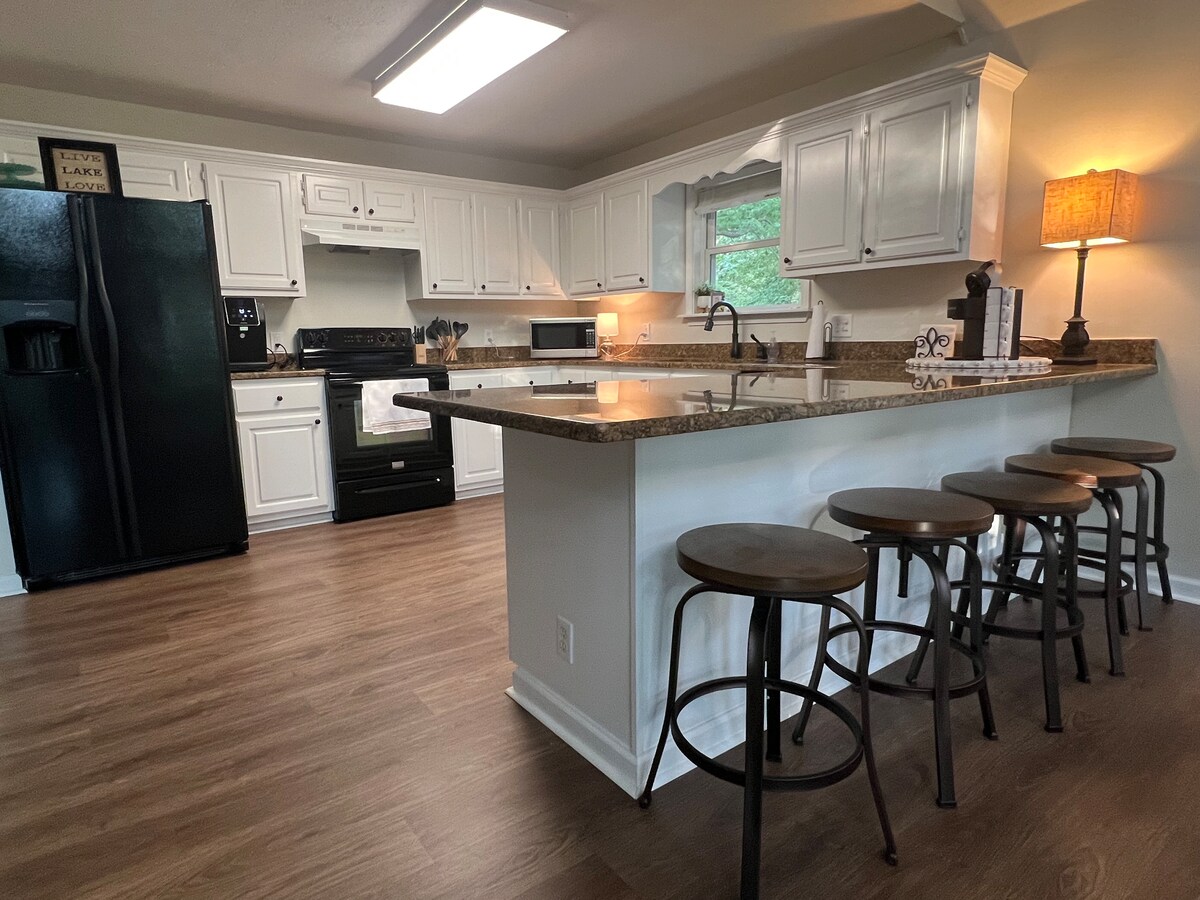 Relaxează-te în acest spațiu calm și elegant. Vino să te bucuri de apusuri de soare frumoase pe puntea ta privată în timp ce te relaxezi într-o cadă cu hidromasaj sau stai în jurul gropii de foc. Bucură-te de acest refugiu confortabil la numai 1,6 km de terenul de golf RTJ și la 3 mile de cea mai apropiată rampă pentru bărci. Această locuință oferă o bucătărie cu o cafenea și un răcitor de vinuri, TV interior/exterior, duș spațios și cadă cu gheare. De asemenea, oferim cârlige pentru utilități pentru bărci și rulote. Bucură-te de o mare varietate de mâncare și divertisment la 10-15 minute distanță.