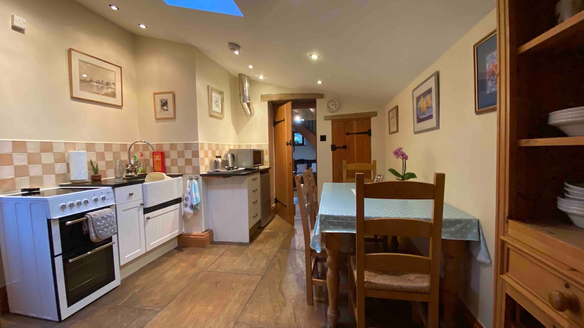 Excelent pentru familii și întâlniri excelente. Retragere liniștită în țara James Herriot, situată pe 9 acri de pajiște cu fân, cu cai de pășunat și oi. Înoată sălbatică în pădurea sa magică sau leagănă-ți picioarele de pe pod . Pierde-te în natură sau bucură-te de priveliștile fermecătoare din camera ta. Bucătărie adiacentă în stil fermă, complet utilată. UFH. Radiatoare în sus. Pat matrimonial Fourposter cu baie proprie. Dormitor suplimentar adiacent. Dormitor cu pat matrimonial cu chicinetă (potrivit pentru scaune cu rotile)
