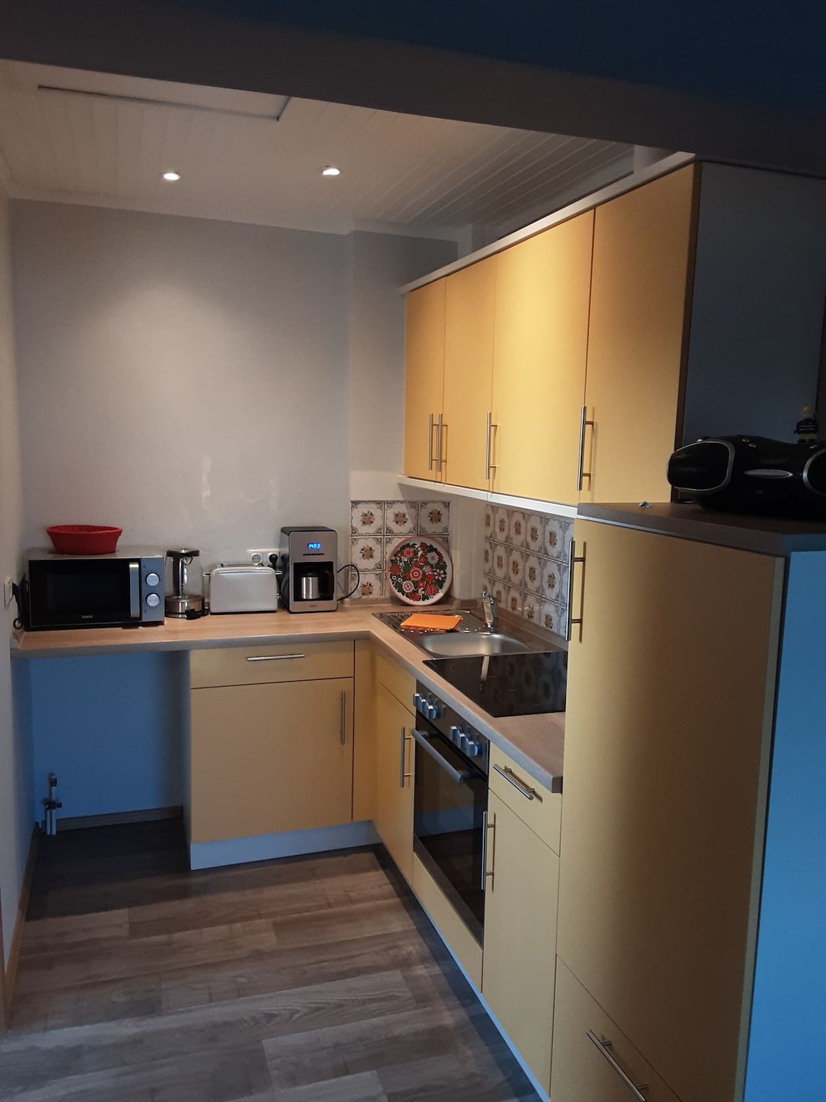 Die Ferienwohnung im Mittelbau des Hauses bietet mit ca.90qm Fläche genügend Platz für 4-5 Personen.Ein gemütlicher und großzügiger Wohn-Ess-Bereich mit Kaminofen lädt zum Entspannen und Verweilen ein. Im oberen Stock befinden sich zwei Schlafzimmer. Die Wohnung verfügt außerdem über ein modernes Badezimmer mit Dusche. Die Terrasse mit Blick in den Garten bietet die Möglichkeit für ein Sonnenbad. Am Abend können Sie hier einen traumhaft schönen Sonnenuntergang erleben. WLAN sowie PKW-Stellplatz.