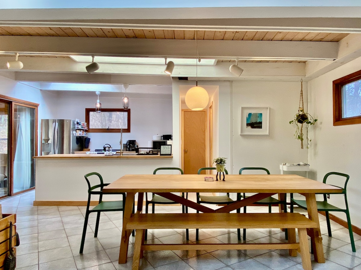 Airy, open 70's modern home in the woods. Rural but only 8 minutes from Saugerties Main Street. Large farm-style dining table for big dinners and hanging out. Privacy and views of woods on 5 acres. Ski at nearby mountains or hang out in Hudson Valley towns nearby. Hiking is plentiful in nearby Catskills. Wake up to views of the forest and country peace and quiet. ***New mini-splits installed 2026 in all rooms for AC and heat***