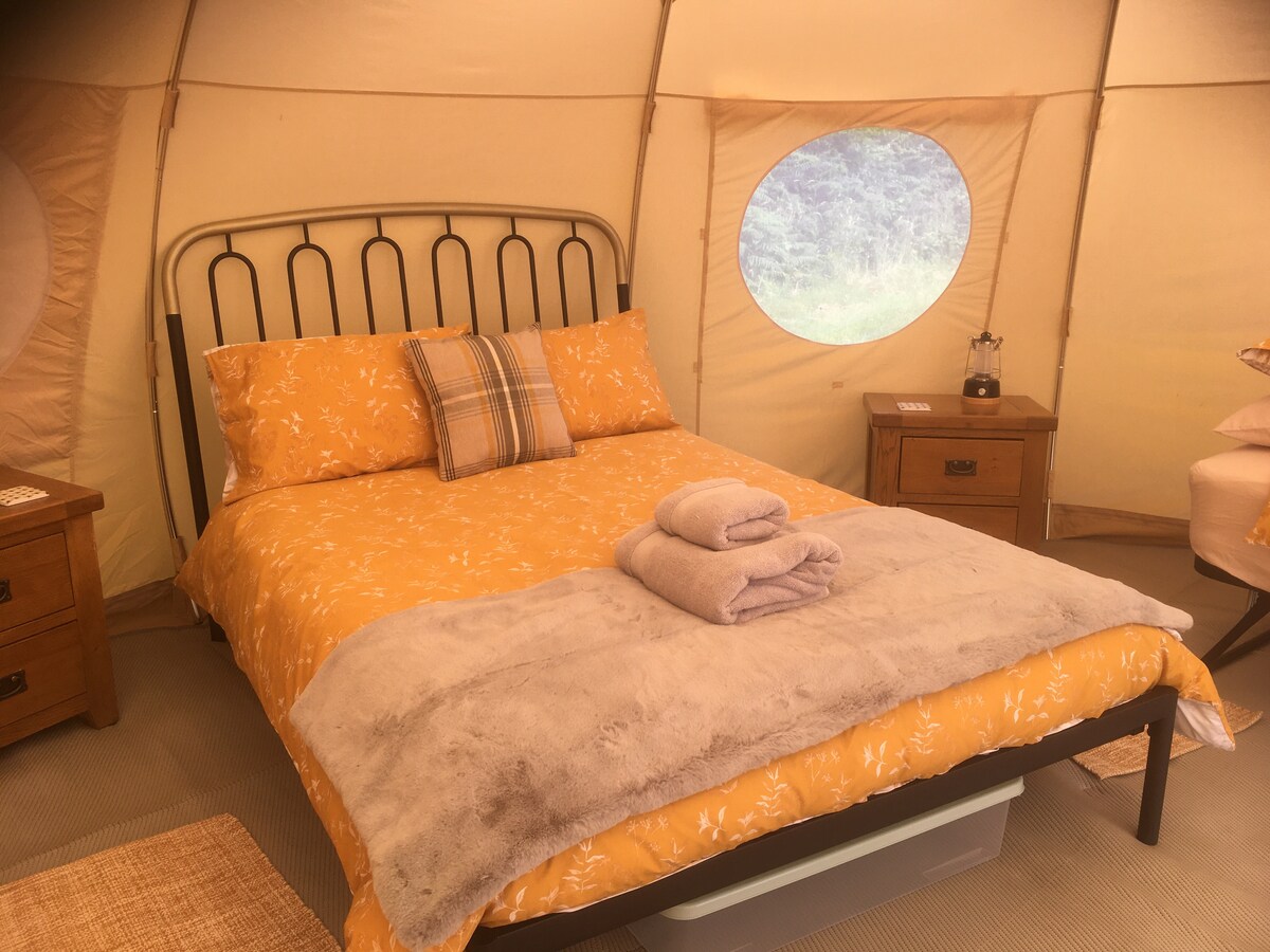 Pentru cea mai bună experiență de familie Somerset, vino și stai în safari-ul nostru premiat Somerset, amplasat în copacii din livada noastră retrasă de 6 ½ acri, la marginea frumosului Parc Național Exmoor. Toate interioarele sunt lucrate manual, cortul principal având o chicinetă, un pat dublu înălțat, baie cu duș, rețea electrică cu căldură prin intermediul unui arzător de lemn minunat. Afară se află o zonă acoperită de terasă, grătar și zonă de foc, ceea ce o face perfectă pentru a scăpa, indiferent de vreme!