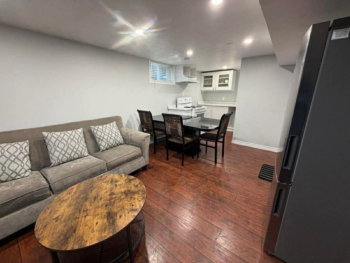 Bucură-te de un apartament la subsol proaspăt renovat, cu 2 dormitoare și 1,5 băi, într-un cartier liniștit, prietenos cu familiile. Spațiu luminos, modern, cu paturi confortabile, o zonă de living elegantă și o bucătărie complet utilată. Perfect pentru cupluri, familii sau excursii la schi - la doar câteva minute de pârtia de schi și aproape de magazinele locale și de produsele esențiale. Curat, calm și conceput pentru o ședere relaxată.