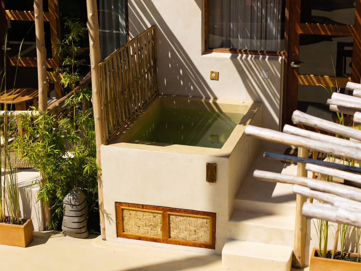 Casele noastre la țară în stil boho au fiecare o baie interioară privată cu duș, un pat matrimonial și o grădină privată pentru relaxare maximă. Bucură-te de piscina mare cu saci de fasole și șezlonguri și vizitează barul nostru pentru micul dejun (inclus) sau o băutură răcoritoare. Decorul este ușor, confortabil și boem. Camera de familie are 2 camere interconectate pentru intimitate, 1 baie și o curte pavată unde te poți relaxa. Perfect pentru familiile care caută atât un spațiu comun, cât și un spațiu personal.