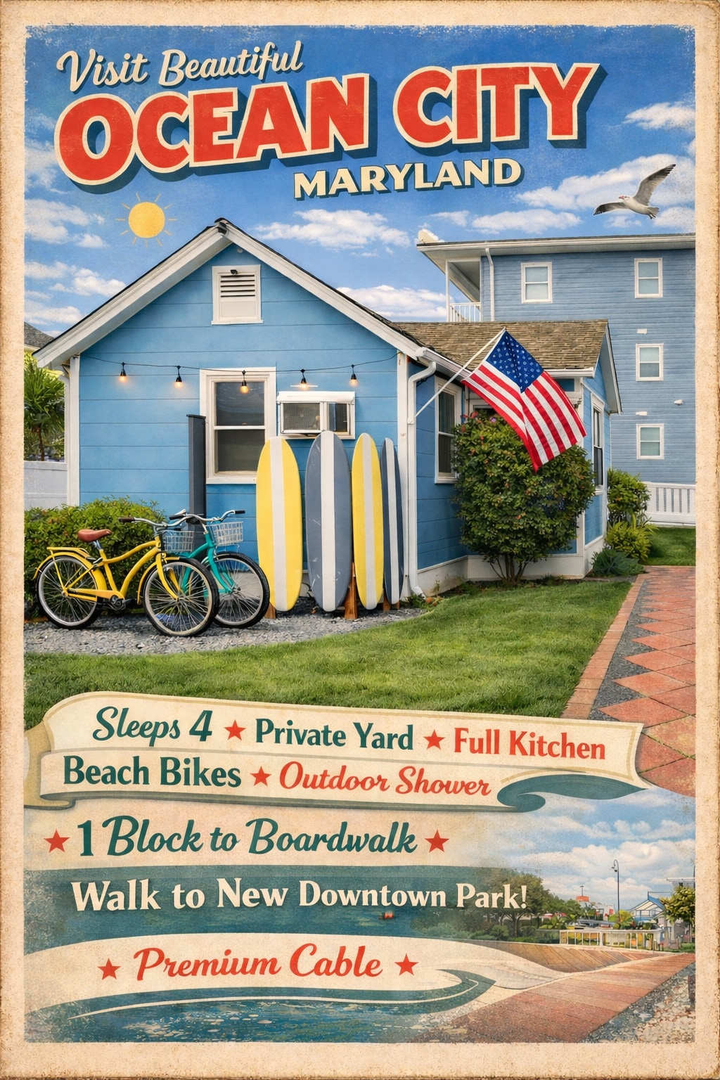 Private yard 🌞 Outdoor shower 🚿 Premium cable/ NFL RedZone/ MLB ticket! 🎟️ Beach 🚲 s Beach chairs and 🏖️! Come enjoy our 1940s bungalow, just one block from the boardwalk, one block from the bay, and brand new downtown park. Our cozy retreat offers a unique blend of vintage appeal and modern amenities. Enjoy the provided beach chairs and umbrella, afternoons in the yard, rinse off under the outdoor shower after the beach, cook in our fully stocked kitchen, or explore town on a bike.