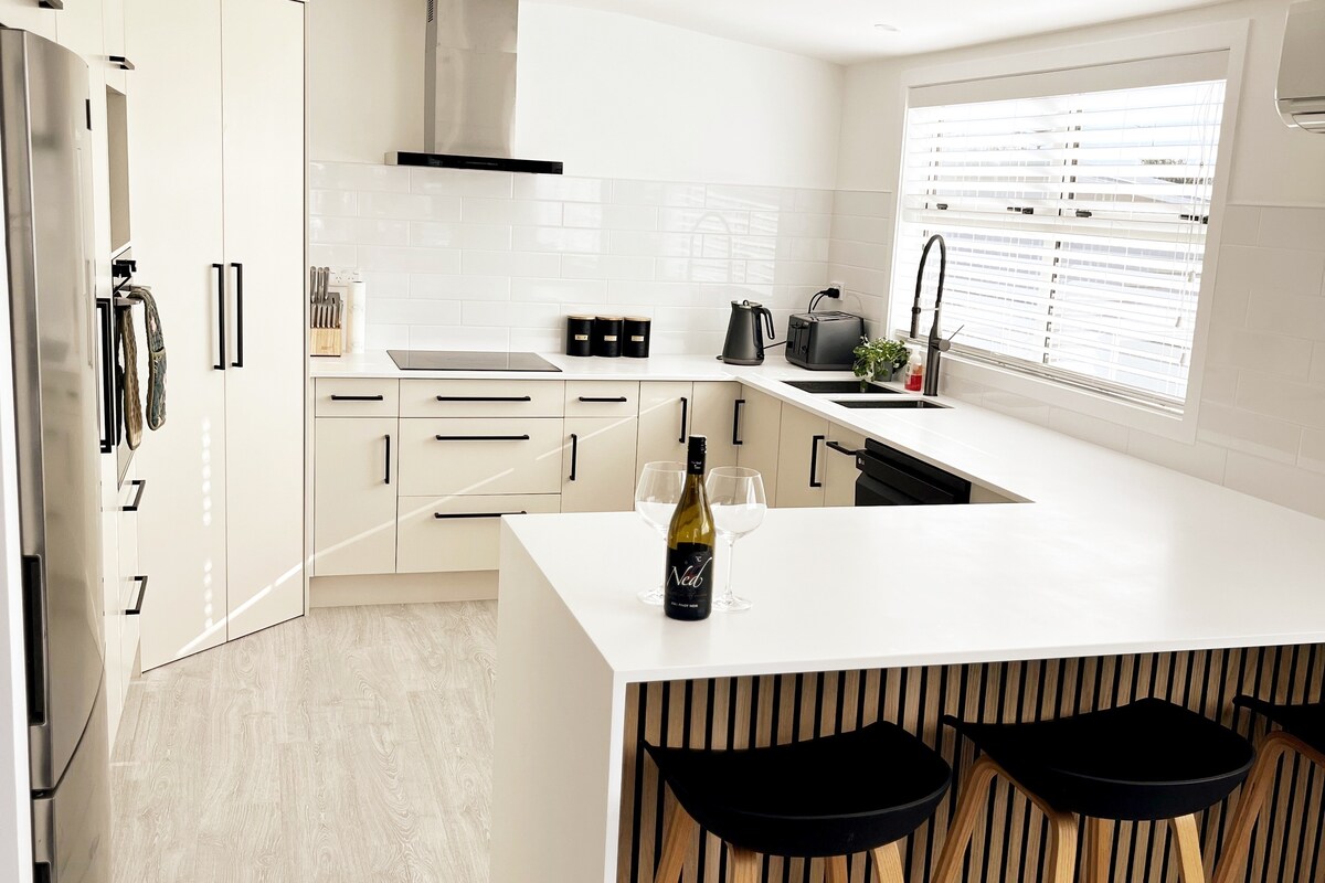 Enjoy our resort-style 4-bedroom, 3-bathroom home, with only a 10-min walk to the beach and shops. Open-plan living which flows to the outdoor entertaining space featuring a BBQ and wood-fired pizza oven. Two bedrooms have private ensuites, and two rooms can be set up as super king or twin beds. Stay entertained with the gym, heated pool, spa pool, and sauna. There is parking for up to 6 cars. Walk or bike to RSA or Saturday farmers market with 4 included bikes. Luxurious year-round relaxation!