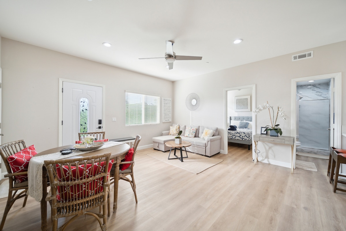 1 pat, 1 baie, bucătărie și living. 1 loc de parcare închis. Din motive de securitate, adresa din Santa Ana este aproape. Adresa exactă din Garden Grove (2,0 mile distanță) va fi trimisă după confirmarea rezervării. Încărcătorul Tesla de nivel 2 este disponibil la 25 USD/zi/mașină. Taxa pentru al treilea oaspete este de 35 USD/noapte (canapeaua extensibilă este disponibilă) Serviciul de autoservire pentru saună este disponibil la 30 $ timp de 2 ore. Te rugăm să ne anunți dacă ai nevoie.
