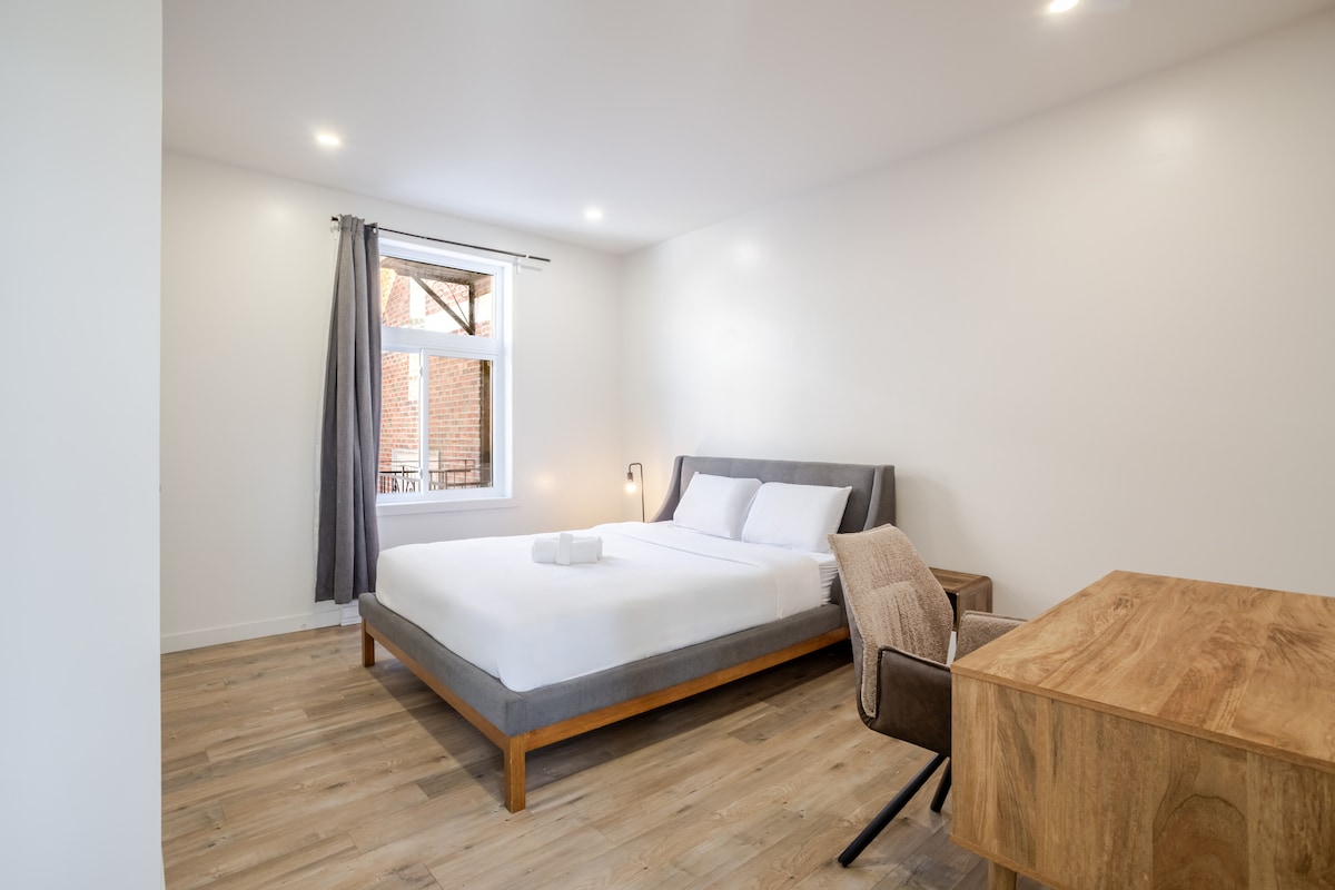 Bine ai venit în unitatea noastră elegantă cu 1 dormitor din Little Italy, Montreal! Concepută pentru confort și comoditate, spațiul nostru este perfect pentru călătorii de afaceri. Accesibil cu un lift comun într-o clădire bine întreținută, bucurați-vă de o atmosferă fermecătoare. Relaxează-te într-un pat matrimonial confortabil, folosește bucătăria complet utilată și relaxează-te în baia și cada spațioase. Rămâi conectat cu Wi-Fi gratuit și Netflix și bucură-te de un kit de dotări de bun venit, cu cafea proaspătă și bunătăți.