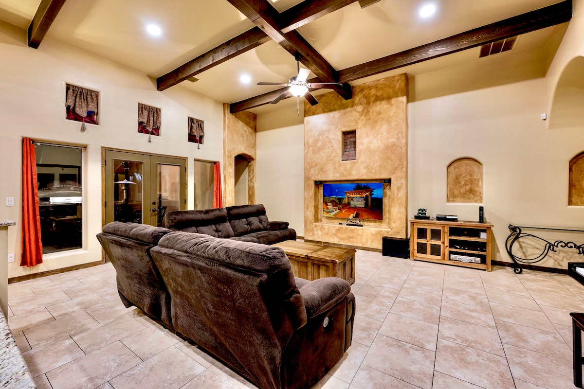 Locuință în stil Pueblo pe 1+ Acre cu piscină! Această locuință fermecătoare 4BR/2BA Pueblo oferă detalii uimitoare. Faianță superbă saltillo în zonele de living, cu accente frumoase din lemn și un șemineu în stil kiva pentru nopți confortabile de iarnă. Suita principală oferă acces direct la terasa acoperită pentru scufundări de vară și la apusurile de soare de seară. Al patrulea dormitor este imens și ar putea fi folosit ca o a doua zonă de living. Piscina nu este încălzită, dar va fi deschisă și curățată tot anul. Îmi pare rău, fără animale de companie.