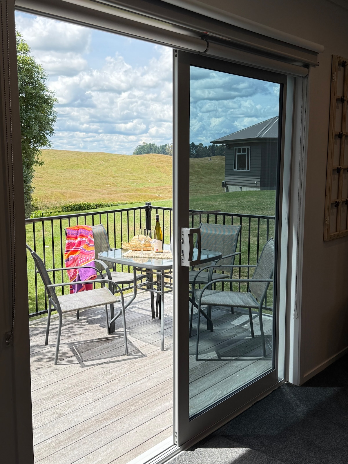 Semi detached sunny compact studio joined to main dwelling by deck located on our lifestyle section. Studio has a deck divided from the main dwelling by a screen for privacy. Private entrance/lock box. Kitchenette, continental breakfast provisions on first morning supplied - microwave available (no stove top or oven) . Samsung Smart TV (Freeview TVNZ+ etc), you will require your own subscription for streaming services. Off street park. You will need a car as there is no public transport.