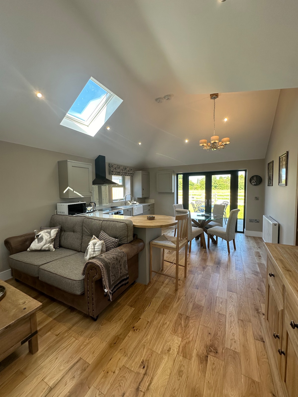 Fă-ți timp și relaxează-te în acest spațiu rural calm, elegant. Bucură-te de timpul petrecut în decorul de lux, înconjurat de terenuri agricole și priveliști frumoase cu dotările locuinței tale. Bucură-te de priveliștea din patul tău super king, de o baie mare de sine stătătoare sau de pe balconul Julietei. Relaxează-te în zona de living mare, urmărind filmele tale preferate pe televizorul inteligent de 75 inch, WIFI și sunetul surround. Ai o bucătărie dotată cu aragaz electric și 2 plite pentru a-ți găti mesele și o masă la care să le mănânci.
